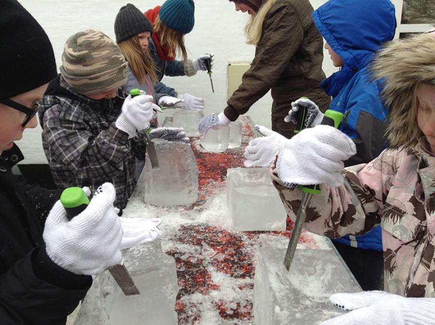 Alle børn får en isblok, et sted at arbejde og værktøj til at bearbejde isen med - med hjælp og vejledning undervejs.