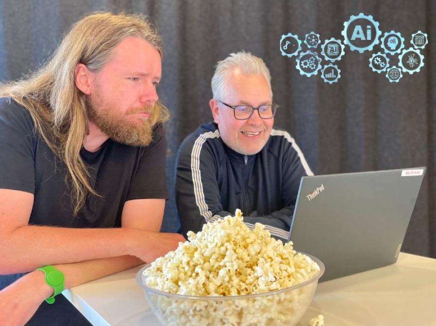 Vores medarbejdere Esben og Trygve sidder klar ved en computer ’Under skyen’, hvor vi skal undersøge og demonstrere, hvad chatbotten kan bruges til - lige fra lavpraktisk hjælp til at forstå de nye skatteregler til kreativ sparringspartner på din fest-invitation.